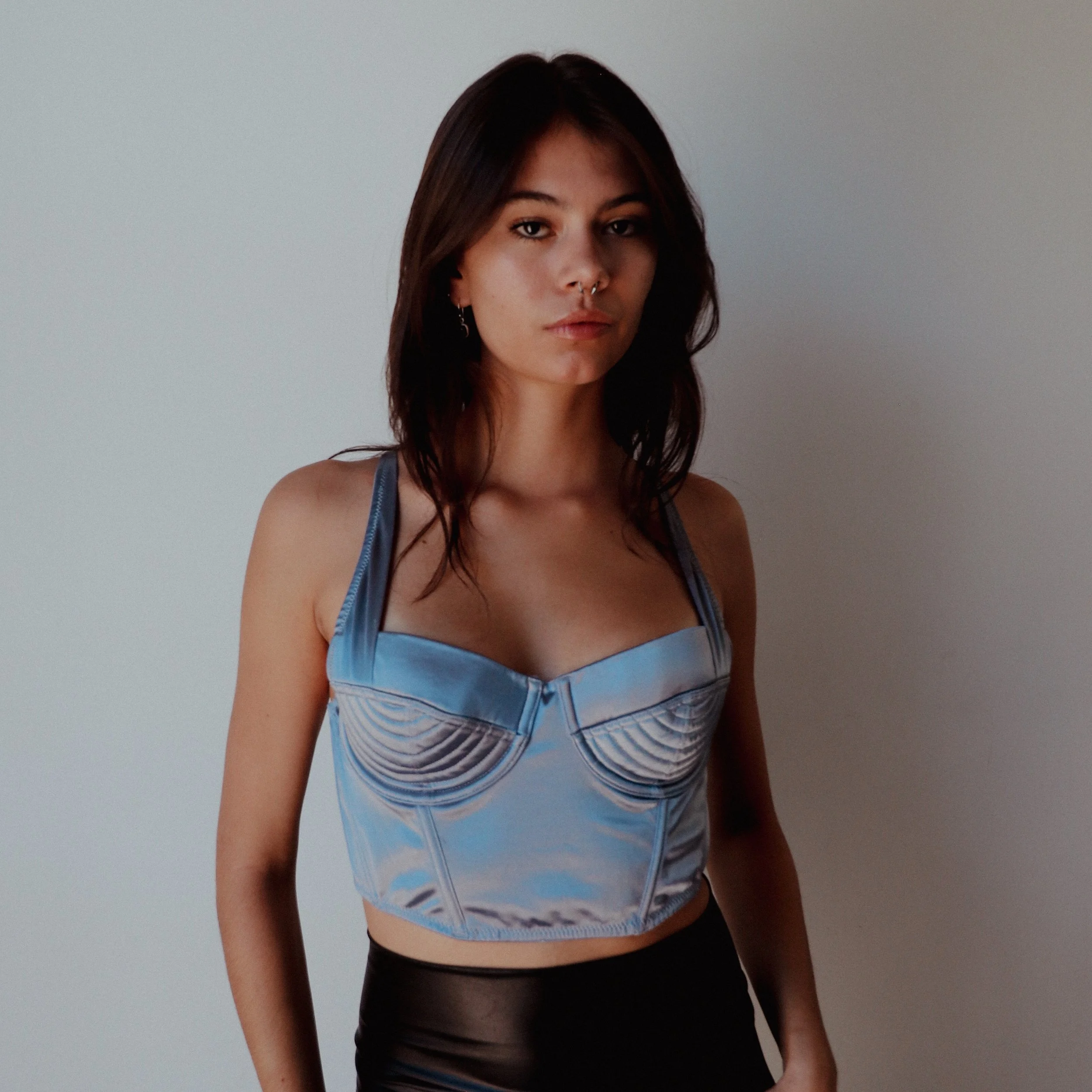 A structured silhouette with a sleek, modern edge. This satin blue bustier features a contoured fit that shapes and defines the waist while offering subtle sheen and sculptural elegance. Finished with boning for support and a smooth satin finish, it pairs effortlessly with tailored trousers, vintage denim, or layered under a blazer for evening wear.
